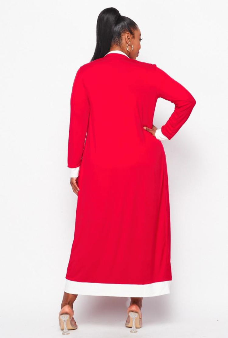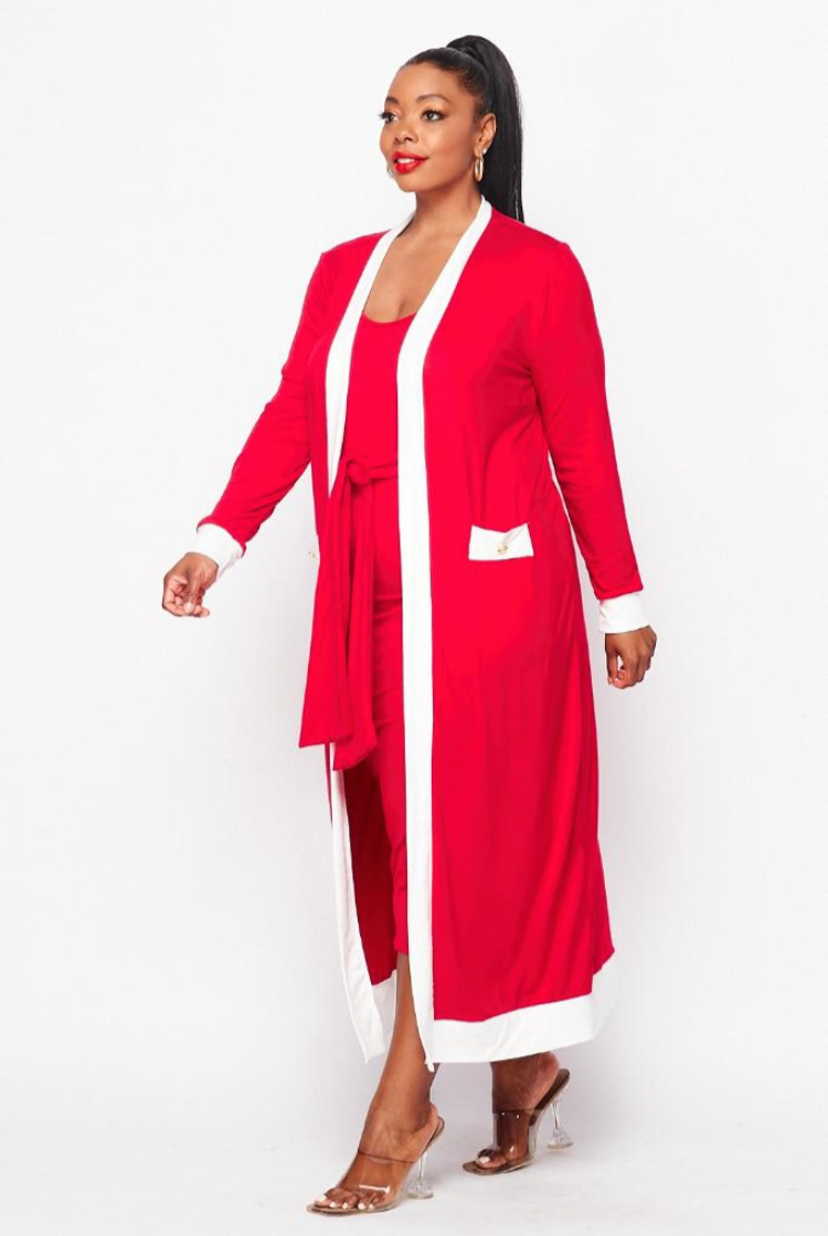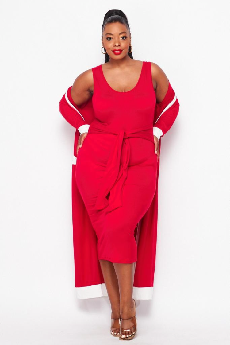 Red and white two-piece Delta Sigma Theta set featuring a sleeveless belted, bodycon dress and matching long duster with an embroidered Delta shield. Ideal for chapter events, conferences, or brunch, this chic outfit combines comfort, elegance, for the women of DST.