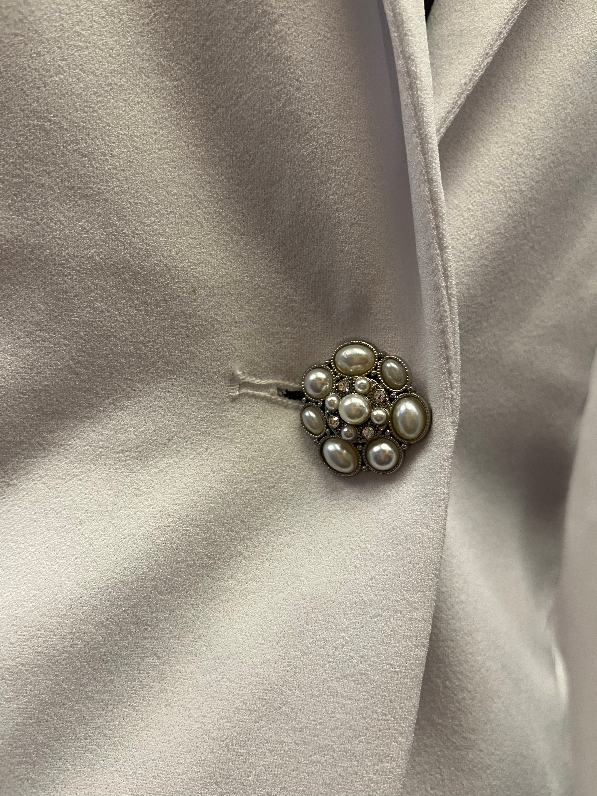 This elegant blazer blends tailored sophistication with meaningful detail. Designed with a clean silhouette, it features a single pearl button closure that adds a refined, feminine touch. The Zeta Phi Beta shield is delicately placed on the chest (peaking behind the lapel) offering a subtle yet powerful expression of pride and sisterhood.