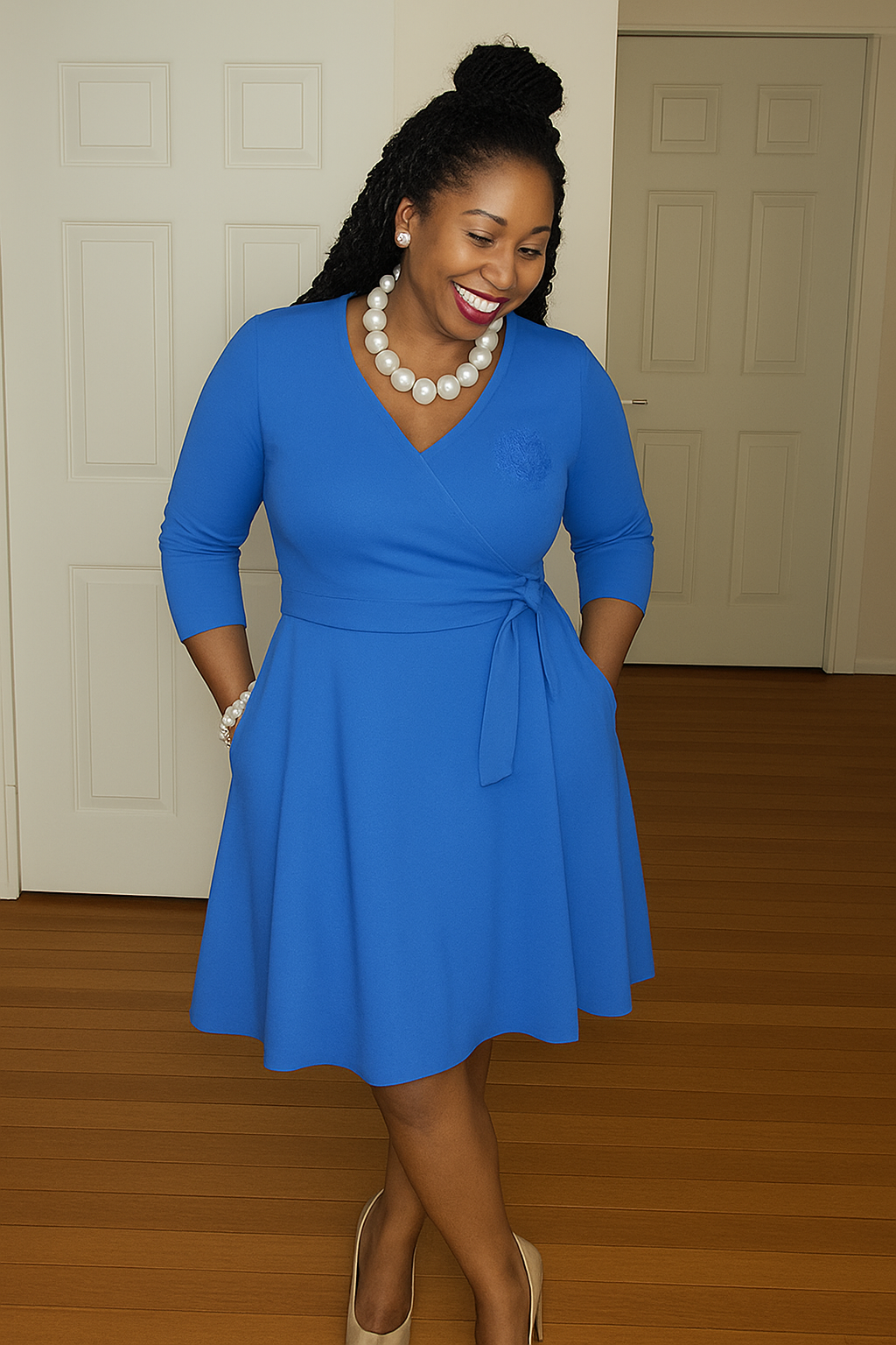 Dress Description: This semi empire waist dress has a fabulous Aline design that is simply flattering to all shapes and sizes. The dress features pockets and will hang at minimum to the knee for slightly taller Sorors. The dress features the ZPB shield on the left side over the heart done in royal blue.